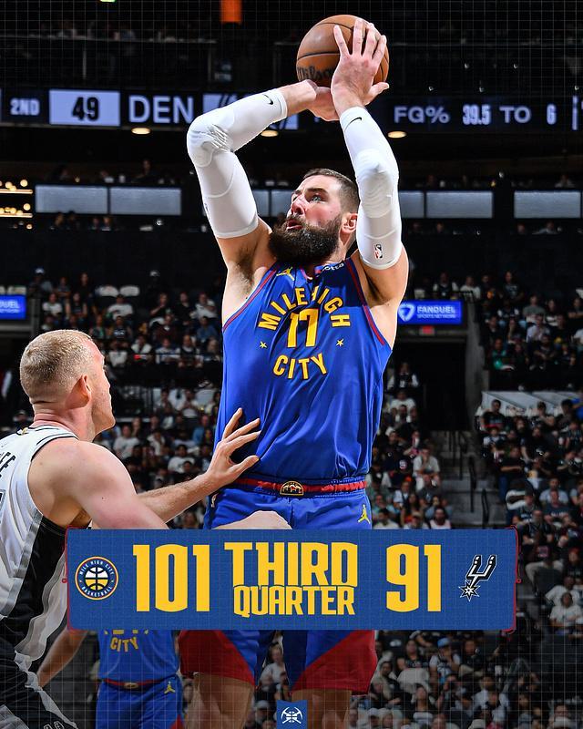 中场休息回来,约基奇在达成65场指标后,下半场由瓦兰丘纳斯顶替他首发出场。掘金连续三节得分30+,马刺本场首次单节得分35+展开对攻。斯特劳瑟三分命中继续率队扩大75-58领先,马刺一波7-0攻势追分,掘金内外开花扩大86-79领先优势。掘金之后继续维持94-79领先优势,马刺略有反扑追分,掘金单节31-35被追回10分,三节结束掘金101-91领先马刺。前三节比赛,掘金三分27中11,约基奇23+8、斯特劳瑟23分;马刺三分33中14,瓦塞尔17分与福克斯16分,引领4人得分上双。