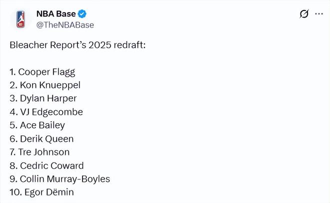 北京时间4月10日,2025-26赛季的常规赛接近尾声,知名美媒Bleacher Report撰文重排2025年选秀。弗拉格仍是状元,克努佩尔被放在榜眼的位置上,而中国球员杨瀚森则掉出首轮。以下是重排后的前10顺位(括号内为原顺位)——