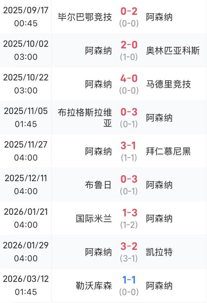 阿森纳本赛季欧冠战绩