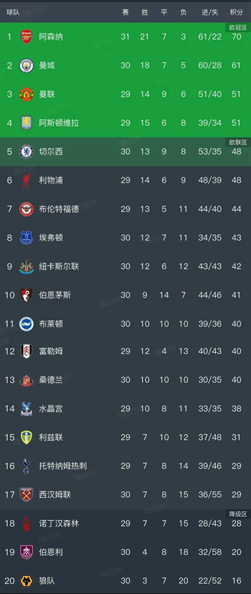 随着阿森纳2-0、曼城1-1,英超最新排名出炉!切尔西排第5