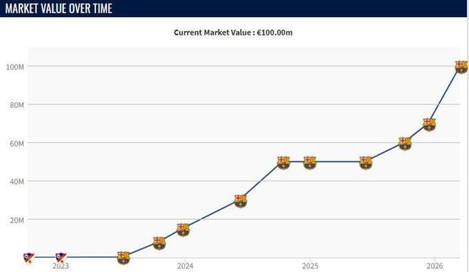 本赛季费尔明身价3次上涨,从5000万欧升到了1亿欧