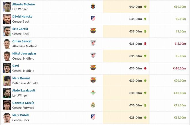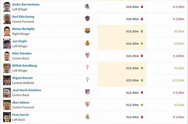 西甲球员本期身价变动详情