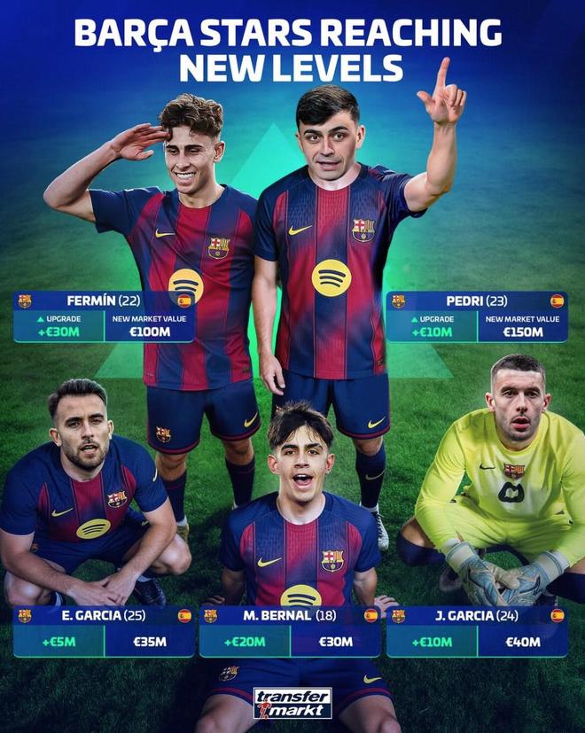 3月16日晚,德国转会市场更新了部分西甲球员的身价。其中,巴萨中场费尔明暴涨3000万欧,身价升至1亿欧,佩德里上涨1000万欧,身价1.5亿欧。贝林厄姆下降2000万欧,身价1.4亿欧。