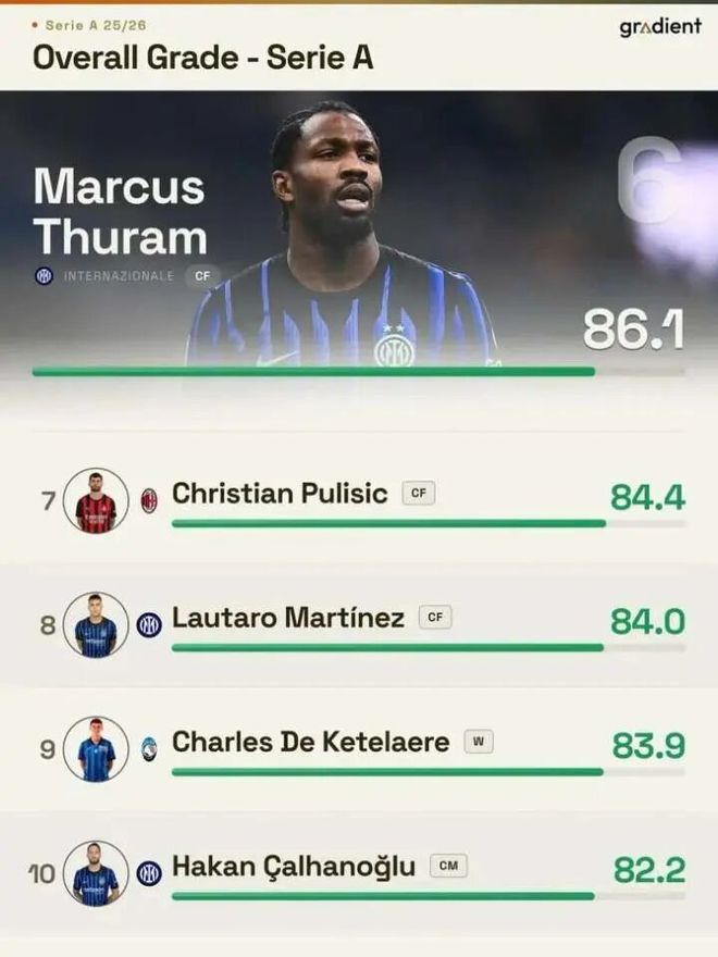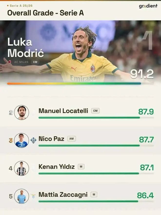 根据数据机构Gradient的统计,本赛季意甲联赛(按场均评分计算)的最佳球员是40岁的莫德里奇。