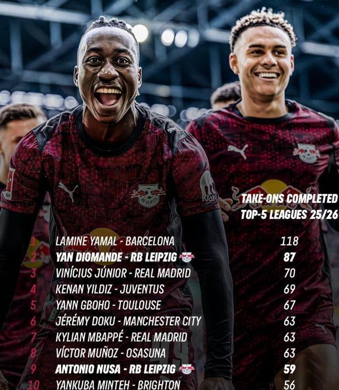 本赛季至今,扬迪奥曼德代表RB莱比锡出战各项赛事29场,交出了11球7助攻的亮眼成绩单。而真正让整个欧洲为之侧目的,是他令人叹为观止的突破能力。到目前为止,扬迪奥曼德的过人数据仅次于亚马尔,是德甲赛场实至名归的过人王。在本赛季五大联赛成功过人次数榜单上,扬迪奥曼德以87次成功过人高居第二,仅次于巴萨天才亚马尔的108次。但别忘了,亚马尔早已是公认的顶级天赋,而这位莱比锡边锋,一年半前还在美国半职业联赛挣扎。