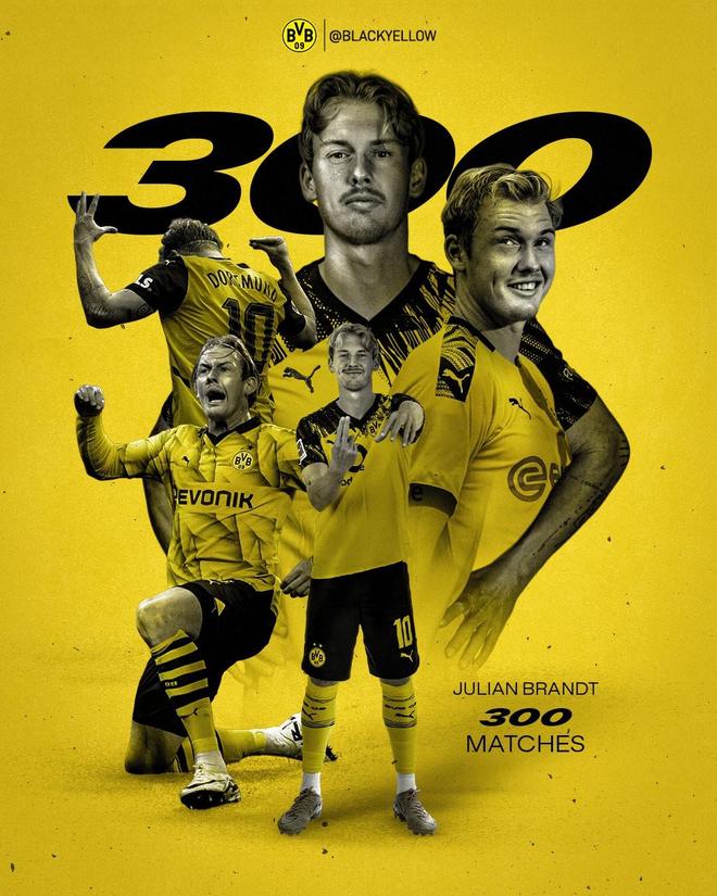 本场比赛,多特中场布兰特替补出场,本场是他代表多特出场的第300场比赛,据统计,布兰特是多特队史第20位达成300场里程碑的球员。