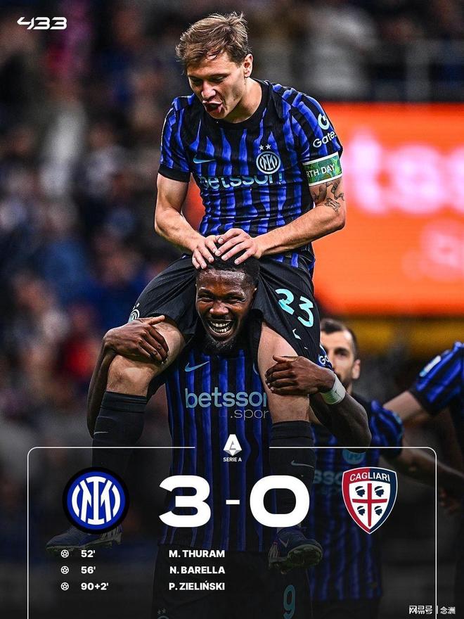 意甲第33轮,国际米兰主场3-0击败卡利亚里,多赛一场领先排名第二的那不勒斯12分。埃斯波西托兜射造险,图拉姆、巴雷拉先后破门,泽林斯基补时阶段再下一城。